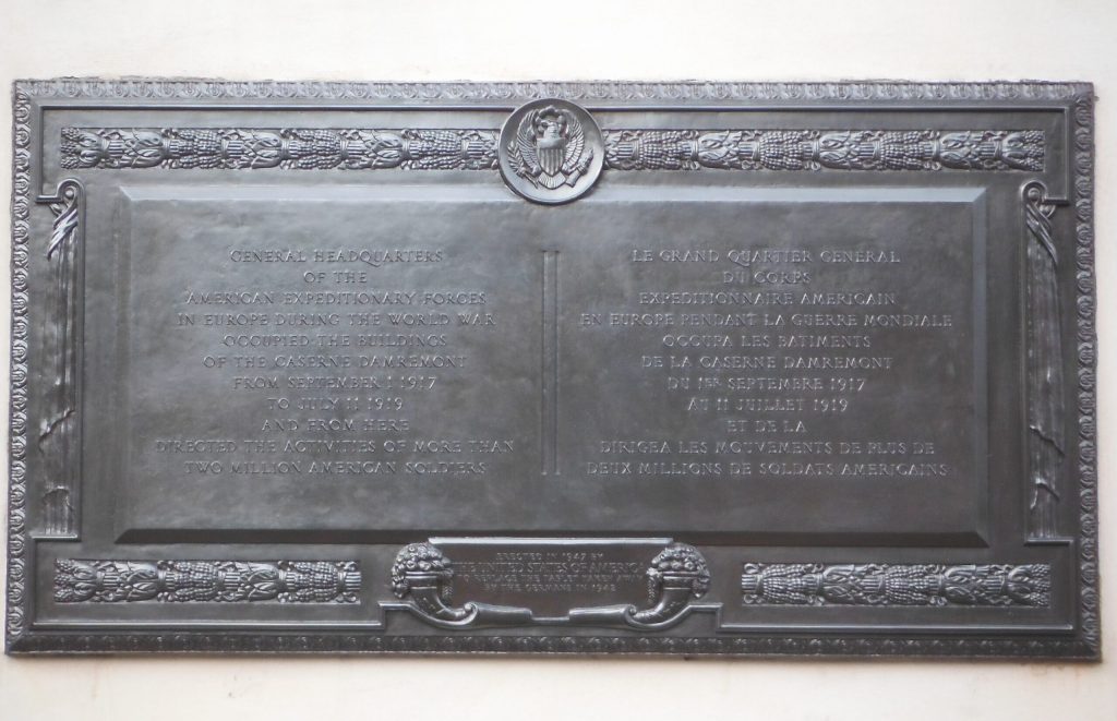 Its inscription in French and English reads as follows: General headquarters of the American Expeditionary Forces in Europe during the World War occupied the building of the Caserne Damremont from September 1, 1917 to July 11, 1919 and from here directed the activities of more than two million American soldiers
