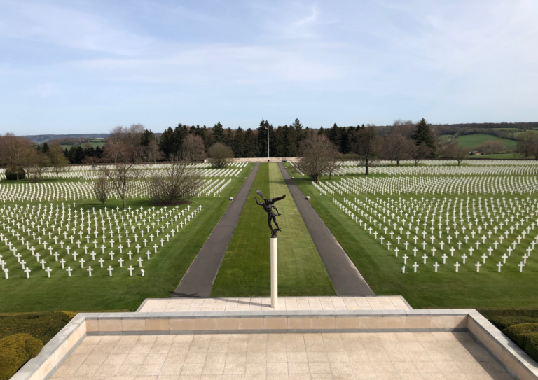 Their headstones are arranged in gentle arcs sweeping across a broad green lawn that slopes gently downhill. A highway passes through the cemetery. West of the highway is an overlook that affords an excellent view of the rolling Belgian countryside, once a battlefield.
