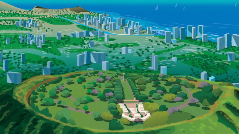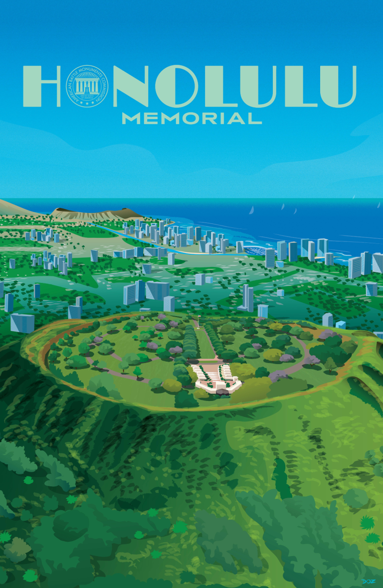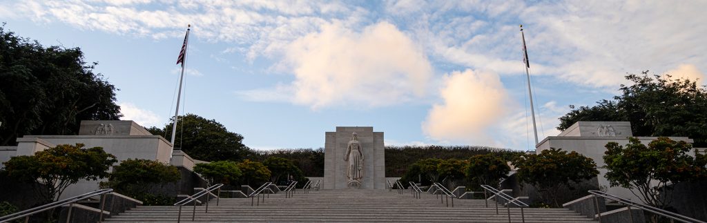 The Honolulu Memorial is located within the National Memorial Cemetery of the Pacific in an extinct volcano near the center of Honolulu, Hawaii.