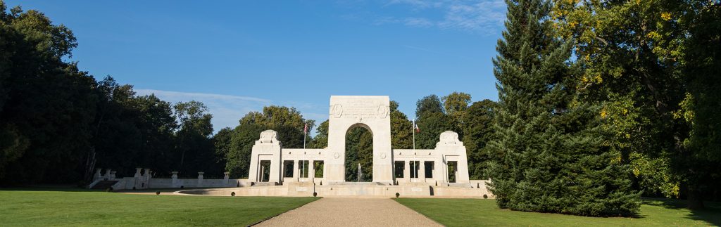 Dedicated in 1928, the memorial cemetery consists of an ornate central arch, half the size of the Arc de Triomphe in Paris, with a French inscription on the façade, and an English translation on the rear. The central arch is flanked by wings on either side that include open hallways terminating in end pavilions. A reflecting pool runs the length of the structure. Behind the memorial is a semi-circular terrace that forms the roof of the crypt below. Stained-glass windows in the crypt depict the major battles of the Western Front.