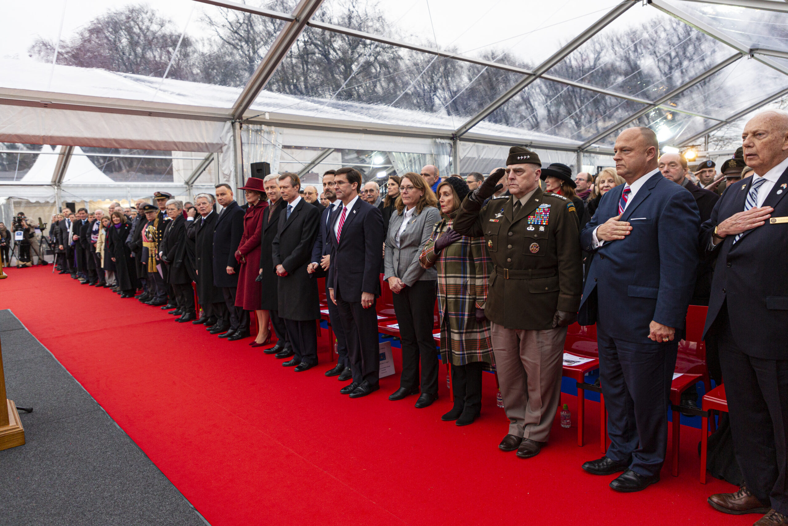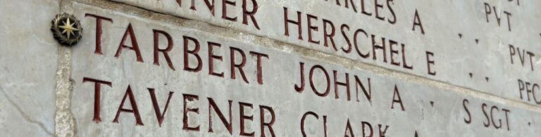 On the lower level of the terrace, two pylons face each other across a quote by Eisenhower about the sacrifice of military service members. The pylons display the battle movements in the western European Operations (on the right) and those related to the Battle of the Bulge (on the left). On the reverse of the maps, 371 names of those missing in action are inscribed. Twenty-three bronze rosettes identify service members who have been recovered since the inscriptions were made and now rest in known graves.