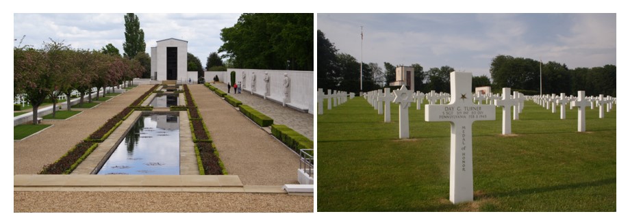 Sloping away from the terrace is the cemetery where 5,070 service members lie, many of whom lost their lives in the Battle of the Bulge and in the advance to the Rhine River. The design is a softly curving fan shape consisting of nine sections interspersed with four fountains, majestic trees, and expansive rose and rhododendron beds. It is a befittingly tranquil final resting place for these Americans who gave their all.