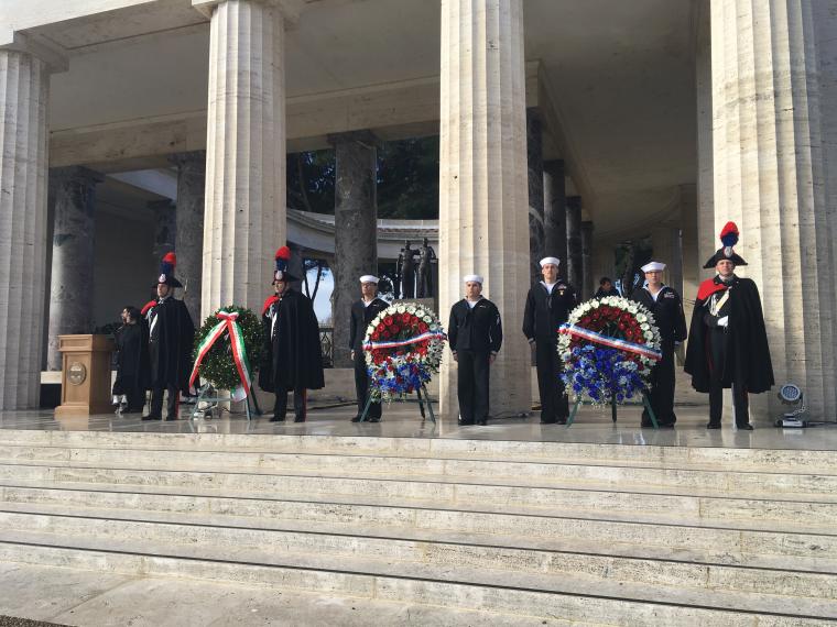 A wide central mall leads to the memorial, rich in works of art and architecture, expressing America’s remembrance of the dead. It consists of a chapel to the south, a peristyle, and a map room to the north. On the white marble walls of the chapel are engraved the names of 3,095 of the missing. Rosettes mark the names of those since recovered and identified. The map room contains a bronze relief map and four fresco maps depicting the military operations in Sicily and Italy. At each end of the memorial are ornamental Italian gardens.