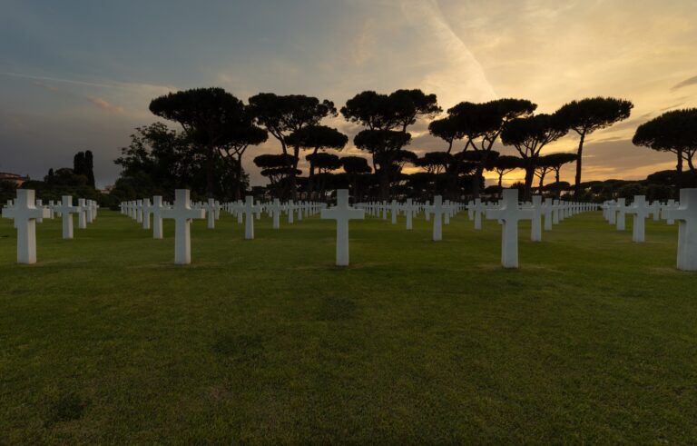 Beyond the pool is the immense field of headstones of 7,845 of American military war dead, arranged in gentle arcs on broad green lawns beneath rows of Roman pines. The majority of these individuals died in the liberation of Sicily (July 10 to August 17, 1943); in the landings in the Salerno Area (September 9, 1943) and the heavy fighting northward; in the landings at Anzio Beach and expansion of the beachhead (January 22, 1944 to May 1944); and in air and naval support in the regions.