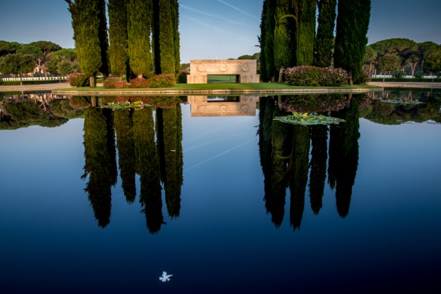 The World War II Sicily-Rome American Cemetery and Memorial site in Italy covers 77 acres, rising in a gentle slope from a broad pool with an island and cenotaph flanked by groups of Italian cypress trees.