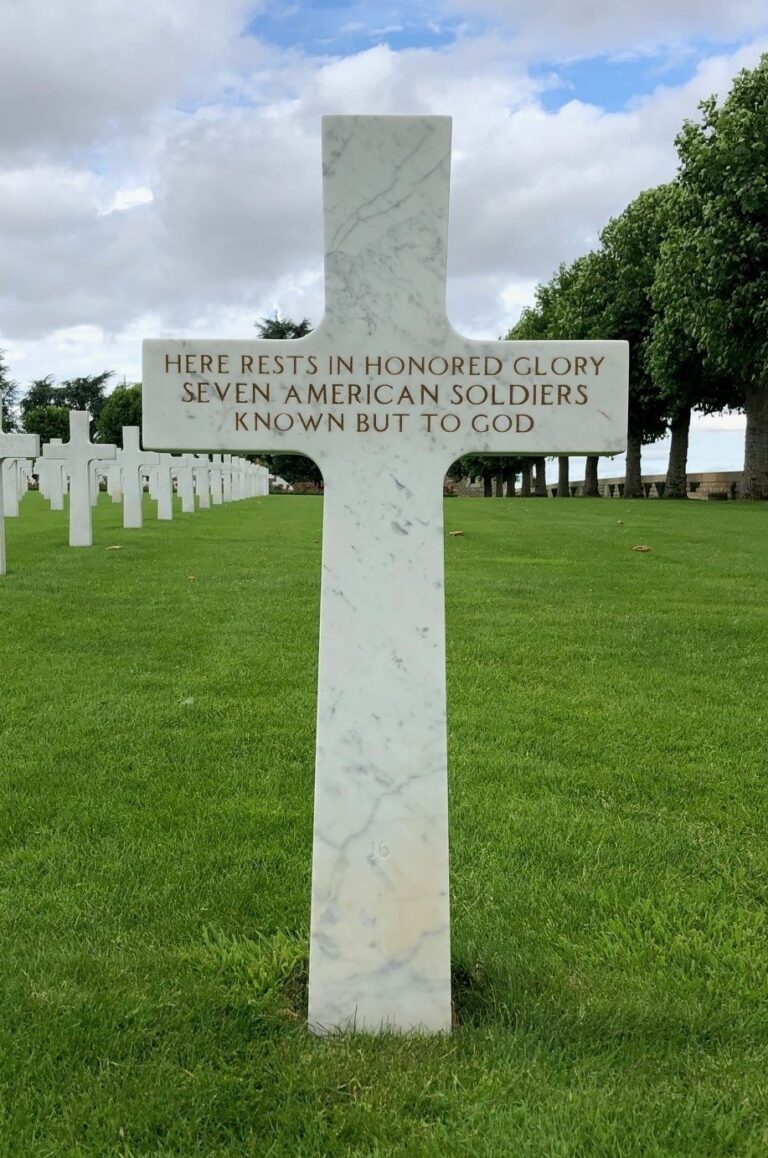 A massive bronze door surmounted by an American eagle leads into the chapel, whose outer walls contain sculptured pieces of military equipment. Once inside, light from a cross-shaped crystal window above the marble altar bathes the subdued interior with light. The walls bear the names of 333 of the missing. A rosette marks the name of the soldier listed on the Walls of the Missing that has since been recovered and identified.