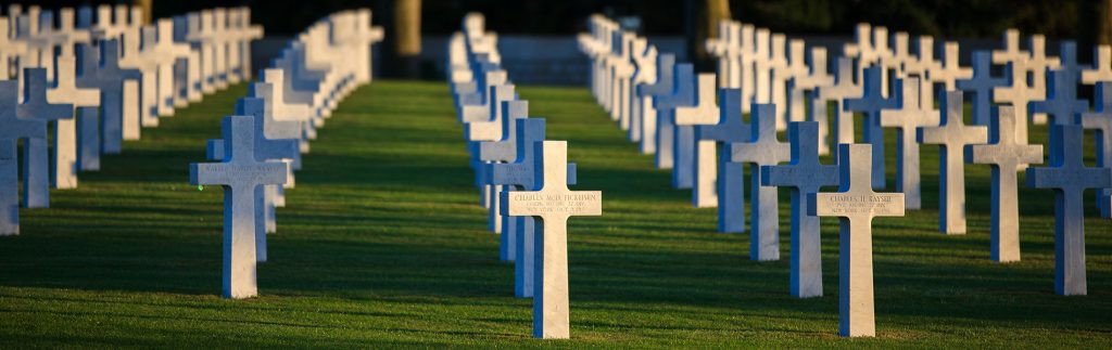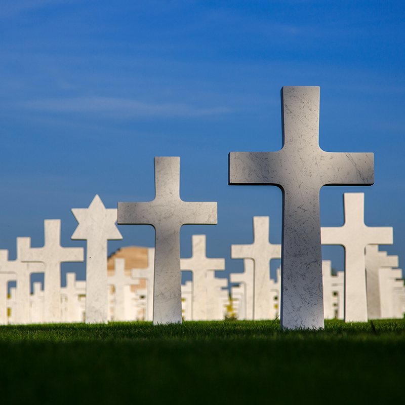 The 14.3-acre cemetery contains the graves of 1,844 of our military dead. Most lost their lives while serving in American units attached to British armies, or in operations near Cantigny. The headstones, set in regular rows, are separated into four plots by paths that intersect at the flagpole near the top of the slope. The longer axis leads to the chapel at the eastern end of the cemetery.