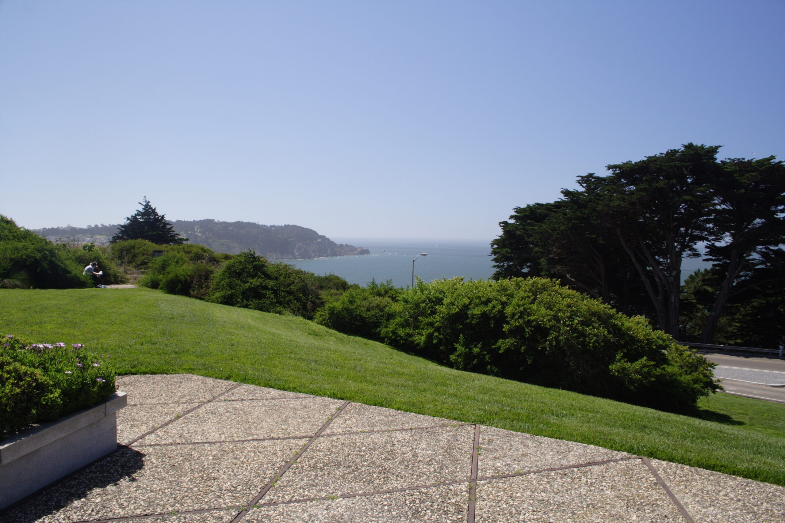 This memorial was erected in the memory of those soldiers, sailors, marines, coast guardsmen, and airmen who met their deaths in the American coastal waters of the Pacific Ocean during World War II. It consists of a curved gray granite wall decorated with bas relief sculpture and a statue of liberty on its right flank. On the wall are inscribed the name, rank, organization and state of each of the 413 American missing whose remains were never recovered or identified. The terrace affords an excellent view of the neighboring shore and the exit from the Golden Gate Bridge to the Pacific Ocean.