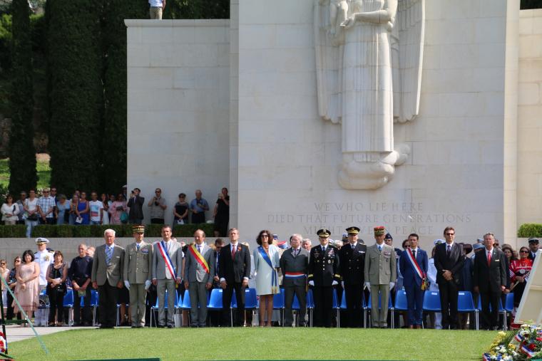 On 12.5 acres at the foot of a hill clad with the characteristic cypresses, olive trees, and oleanders of southern France, rest 851 of our military dead, most of whom lost their lives in the liberation of southern France in August 1944. Their headstones are arranged in straight lines, divided into four plots, and grouped about an oval pool. At each end of the cemetery is a small garden. On the hillside overlooking the cemetery is the chapel with its wealth of decorative mosaic and large sculptured figures. Between the chapel and the burial area, a bronze relief map recalls military operations in the region. On the retaining wall of the terrace, 294 names of the missing are inscribed. Rosettes mark the names of those since recovered and identified.