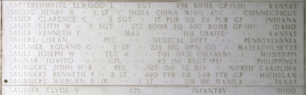 U.S. Army 1st Lt. Wilburn R. Saunders Jr., 29, killed during World War II, was accounted for Aug. 12. Saunders was assigned to Battery H, 59th Coast Artillery Regiment on the Bataan Peninsula, in the Philippines.