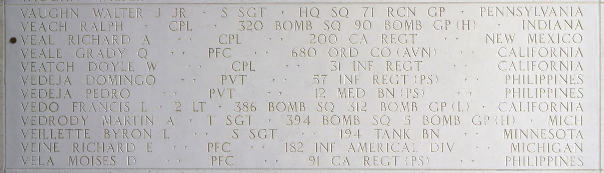 U.S. Army, Cpl. Richard A. Veal, 36, who was captured and died as a prisoner of war during World War II, was accounted for Sept. 29. Veal was a member of Battery C, 200th Coast Artillery Regiment when Japanese forces invaded the Philippine Islands in December 1942.