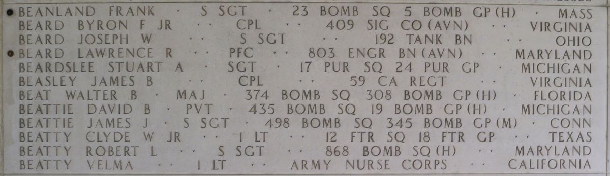 U.S. Army Pfc. Lawrence R. Beard, 27, who was captured and died as a prisoner of war during World War II, was accounted for June 26. Beard was a member of Headquarters Company, 803rd Engineer Battalion (Aviation) in the Philippines.