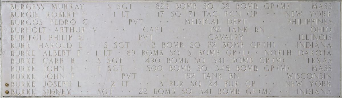 U.S. Army Air Forces 2nd Lt. Joseph L. Burke, 30, killed during World War II, was accounted for June 10. Burke was assigned to Battery F, 60th Coast Artillery Regiment, on the Bataan Peninsula, in the Philippines.