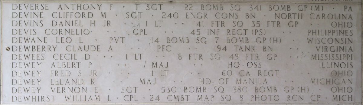 U.S. Army Pfc. Claude A. Dewberry, 29, killed during World War II, was accounted for June 11. Dewberry was assigned to Medical Detachment, 194th Tank Battalion on the Bataan Peninsula, in the Philippines.