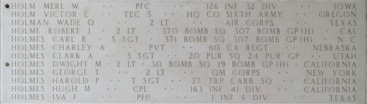 U.S. Army Air Forces 2nd Lt. Dwight M. Holmes, 27, killed during World War II, was accounted for June 24. Holmes was assigned to 30th Bombardment Squadron, 19th Bombardment Group, V Bomber Command on the Bataan Peninsula, in the Philippines.