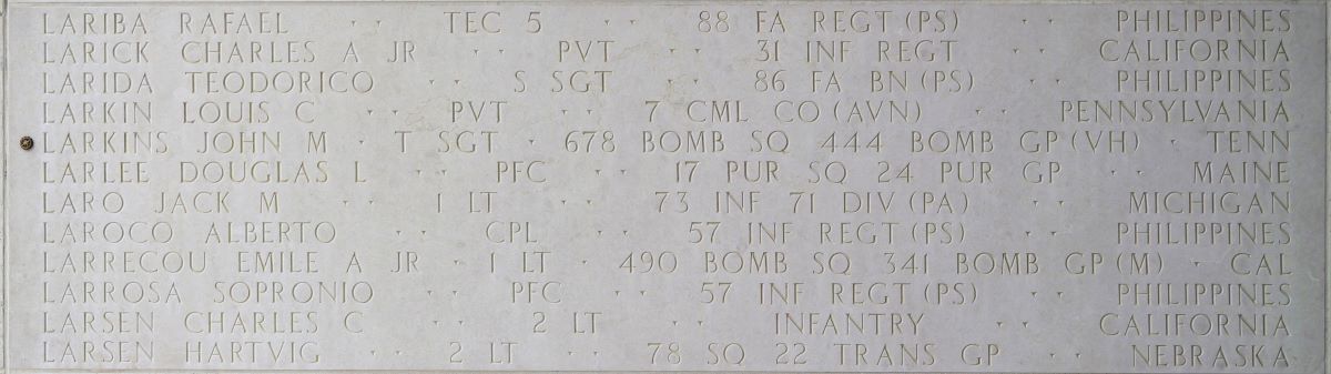 U.S. Army Air Forces Tech. Sgt. John M. Larkins, 26, killed during World War II, was accounted for June 13. Larkins was assigned to the 678th Bombardment Squadron, 444th Bombardment Group (Very Heavy), Bomber Command.