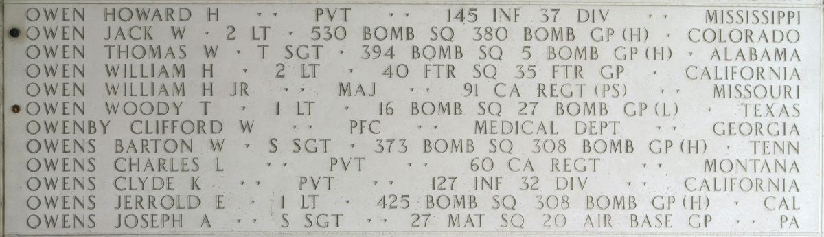 U.S. Army Air Forces 1st Lt. Woody T. Owen, 25, killed during World War II, was accounted for June 30. Owen was assigned to 16th Bombardment Squadron, 27th Bombardment Group on the Bataan Peninsula, in the Philippines.