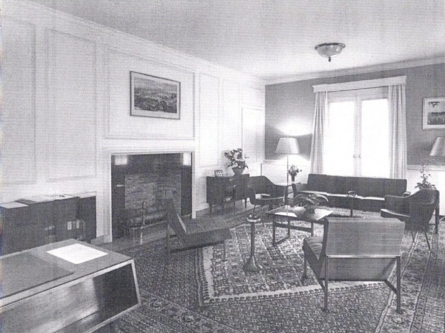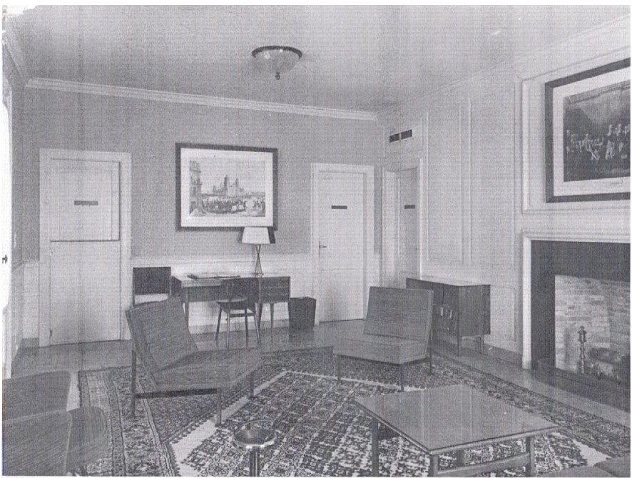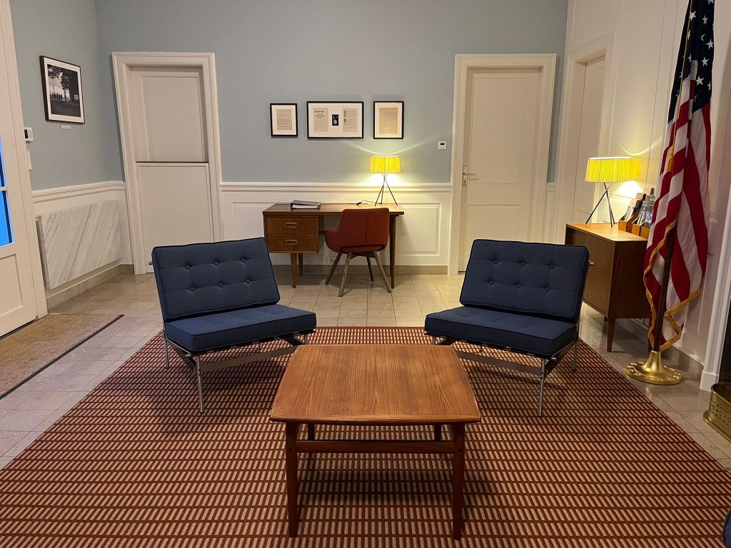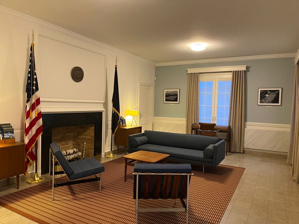 The room was originally furnished in a Mid‑Century Modern style, a choice that sparked debate at the time. Gen. North advocated for uniformity across ABMC sites, while Commissioner McCrown favoured a comfortable American aesthetic. Architect consultant Harbeson argued for a contemporary Mid‑Century Modern approach aligned with the building’s architecture, featuring clean geometric lines and a subtle blend of natural and industrial materials. North ultimately supported Harbeson’s recommendation.