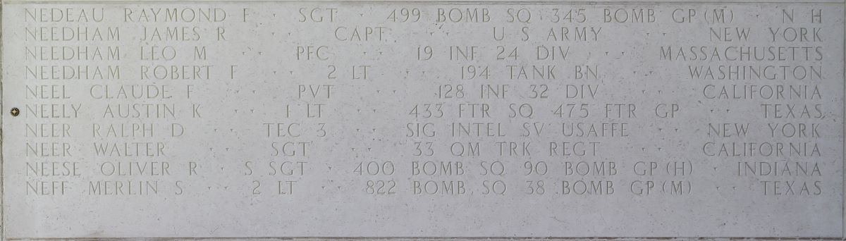 U.S. Army Air Forces 1st Lt. Austin K. Neely, 26, killed during World War II, was accounted for on Dec. 1, 2025. In Spring 1944, Neely was assigned to the 433rd Fighter Squadron, 475th Fighter Group as a P-38J pilot.