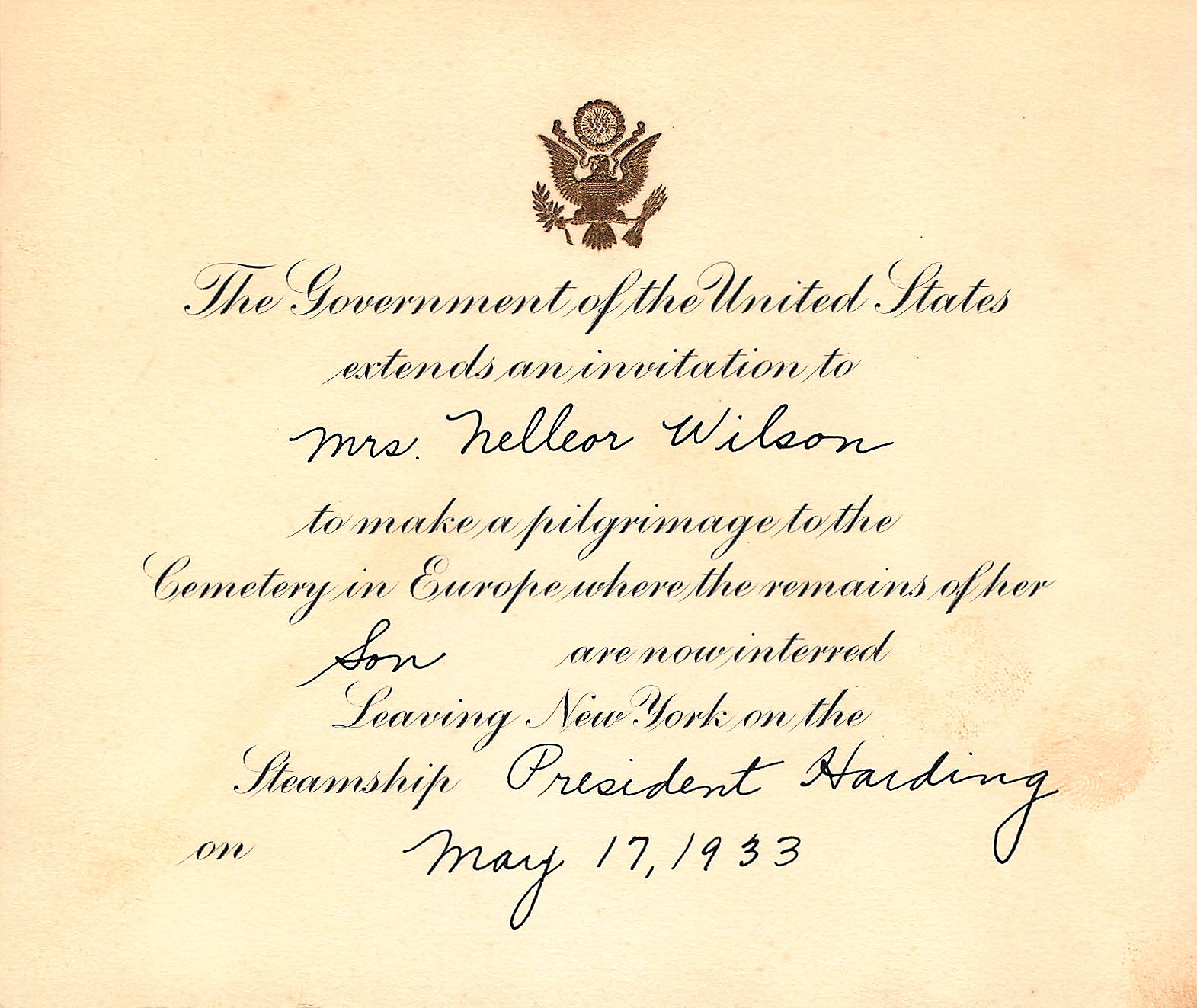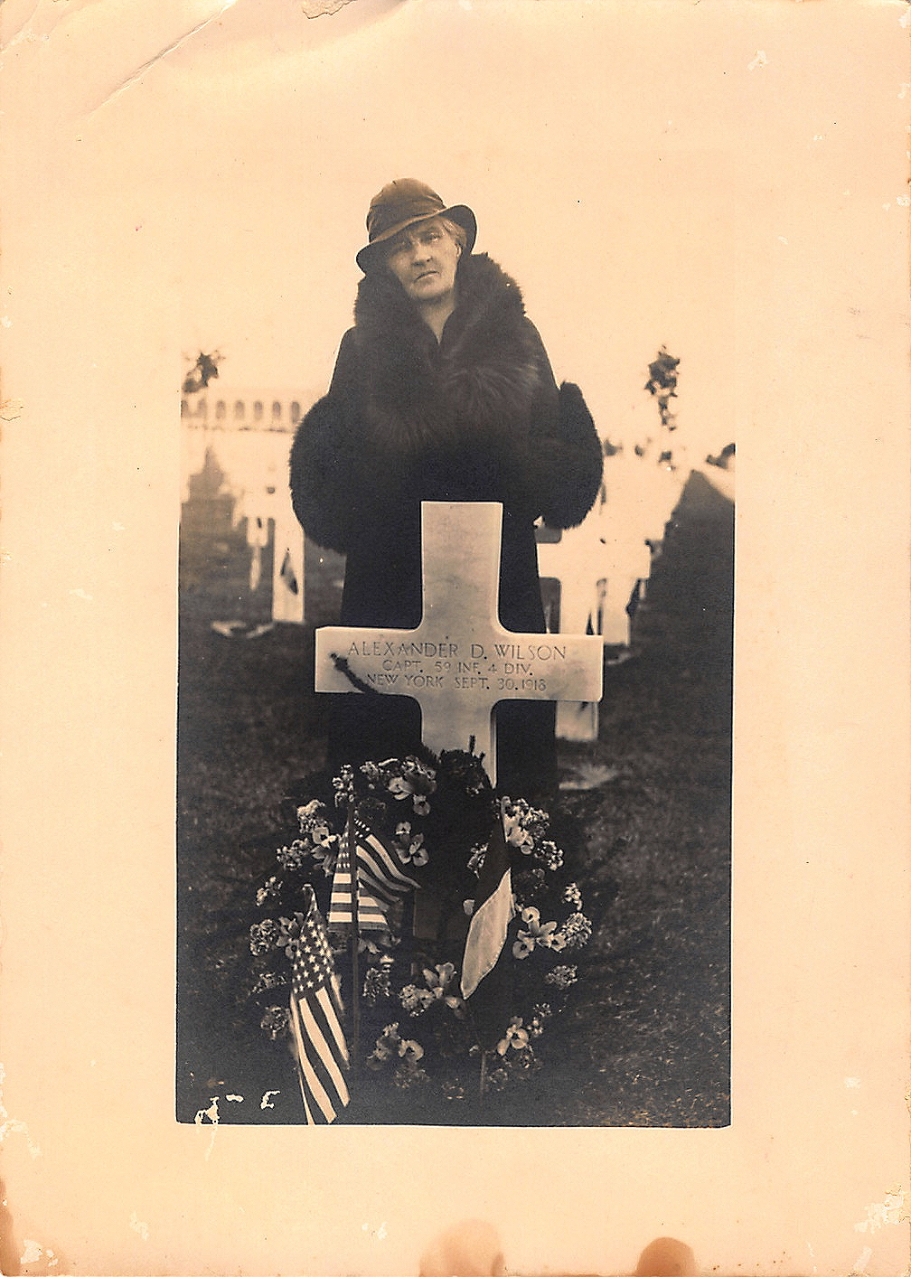 In the 1930s, the American government established the Gold Star Mothers Program, which paid for the mothers of deceased American service members to visit their loved one’s graves abroad. In 1933, Wilson’s mother, Mrs. Nelleor Wilson, was invited to join the pilgrimage and she participated in 1934. Captain Wilson’s grave can still be found in the Meuse-Argonne American Cemetery in Romagne-sous-Montfaucon, France.