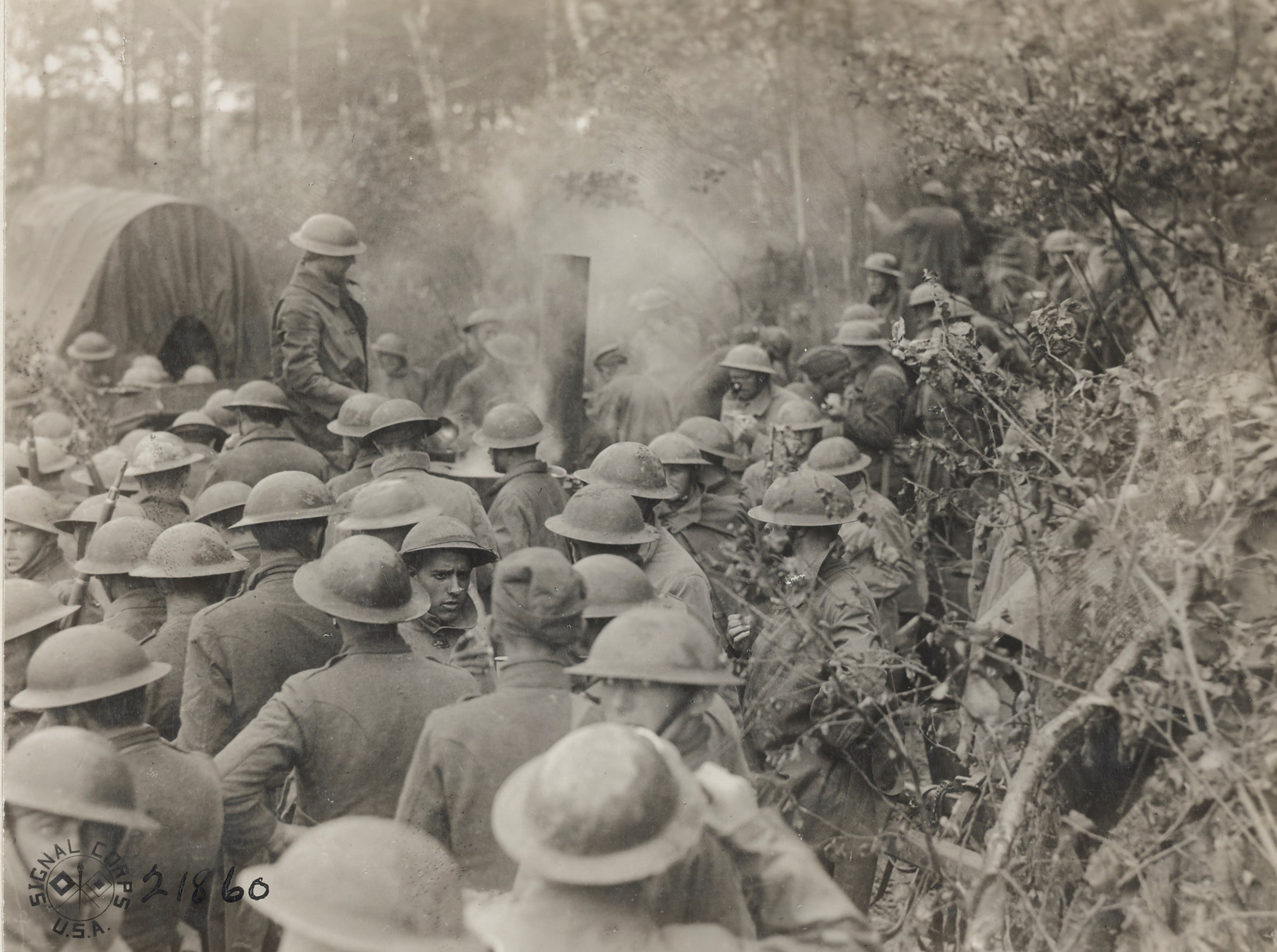 Hanson, Colonel A. H. Men of the 32nd, 28th, and 4th Div. receiving warm food…..Mont-St.-Martin, France. Photograph. August 6, 1918. National Archives and Records Administration (111-SC-21860). Image.