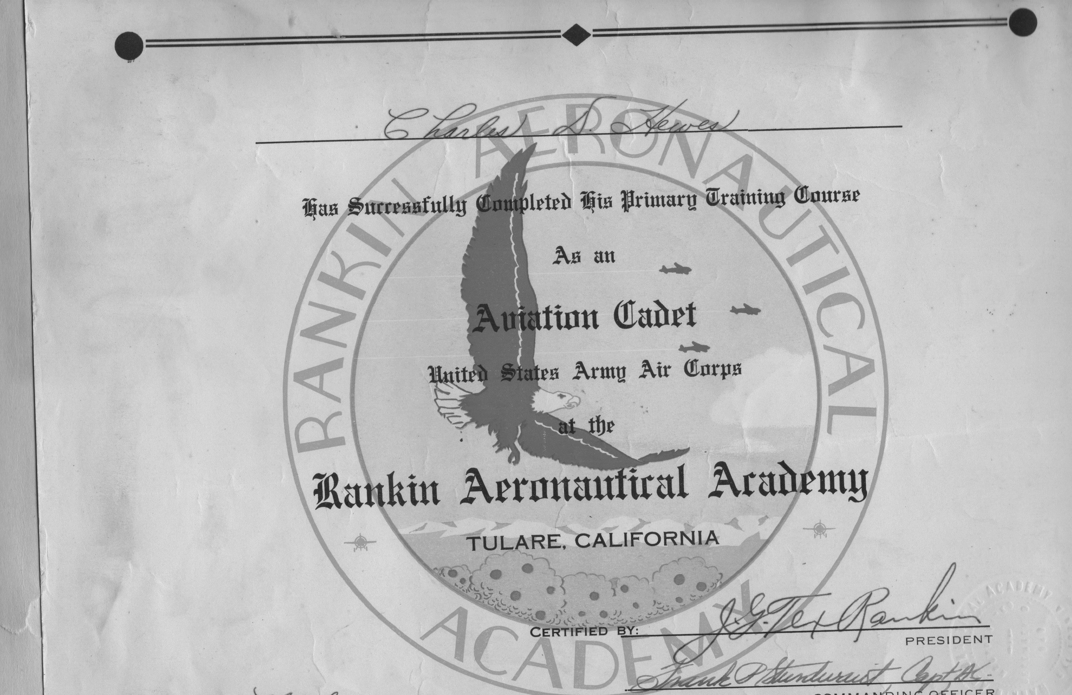 Hewes enlisted October 1939 in the Army Air Corps and studied meteorology. Even though he did not have the required two years minimum of college, he was allowed to sit for the flying cadet exam. Hewes’ initial ten-week flying training program took place at Rankin Field in January 1942. In order to join flight training, Hewes had to start over and elected to be reduced to the rank of private, but soon rose through the ranks to become Aviation Cadet First Sergeant of Company B. He graduated on March 26, 1942.