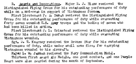 Ducat was posthumously promoted from first lieutenant to captain. He was also posthumously awarded the Distinguished Flying Cross for heroic actions on June 11, 1966, “for his outstanding performance of duty while evacuating forty-seven US Army Troops and the bodies of seven who had been killed in action.” While in Vietnam, Ducat logged over 1,300 hours of airtime.