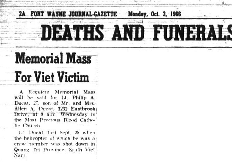 “Memorial Mass for Viet Victim.” October 3, 1966, Fort Wayne Journal-Gazette [Fort Wayne, IN], October 3, 1966. Allen County Genealogical Society of Indiana. https://www.acgsi.org/military/vietdead/ducat.philip.jpg.