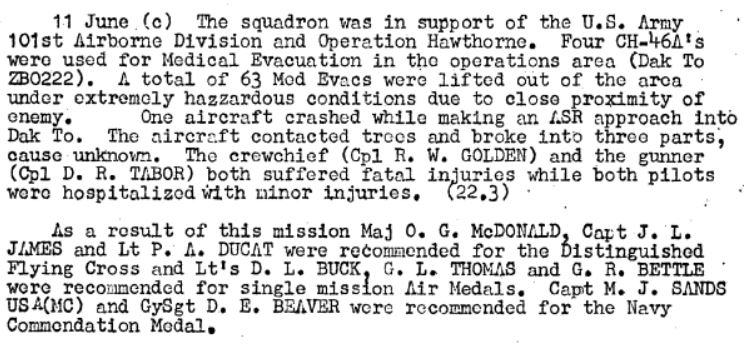 Four helicopters were sent in to assist with medical evacuations, including one piloted by Ducat. On that day, over 63 Marines were airlifted out of Dak To “under extremely hazardous conditions.” Ducat was recommended for the Distinguished Flying Cross for his efforts during this mission.