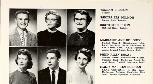 Ducat attended St. Mary’s School, a Catholic grade school where he was a member of the school safety patrol. Afterward, he entered North Side High School, where he was an active participant in many extracurricular activities. Ducat was a standout on the Redskins varsity football team getting named to the All-City team as a guard. He was a member of the 1956 state champion track team, the vice president of the student council, a member of the Helicon Literary Club, and a member of the cheer block. Ducat was also often seen driving in his 1949 Mercury.