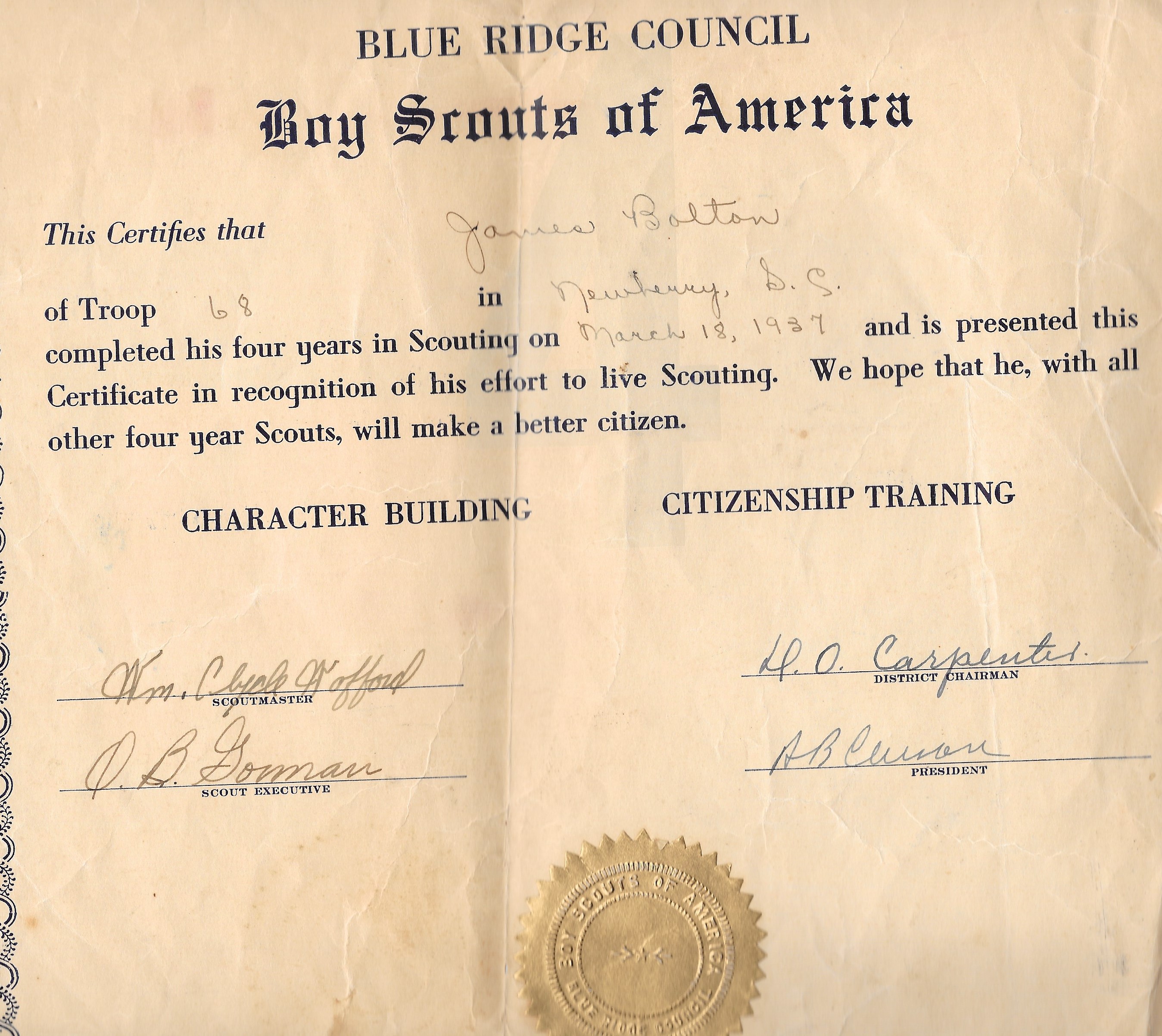 James William Bolton was born on July 3, 1920, and grew up in Newberry County, South Carolina. His parents, Mary Bolton and Russell Marion Bolton, lived in Goldville, South Carolina, a railroad community later known as Joanna, South Carolina. Russell was employed as a slasher in a textile mill in the area. Slashers worked on an assembly line and applied starch to protect sheets of fabric in the warping process in preparation for weaving.
