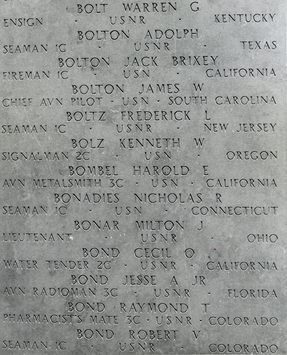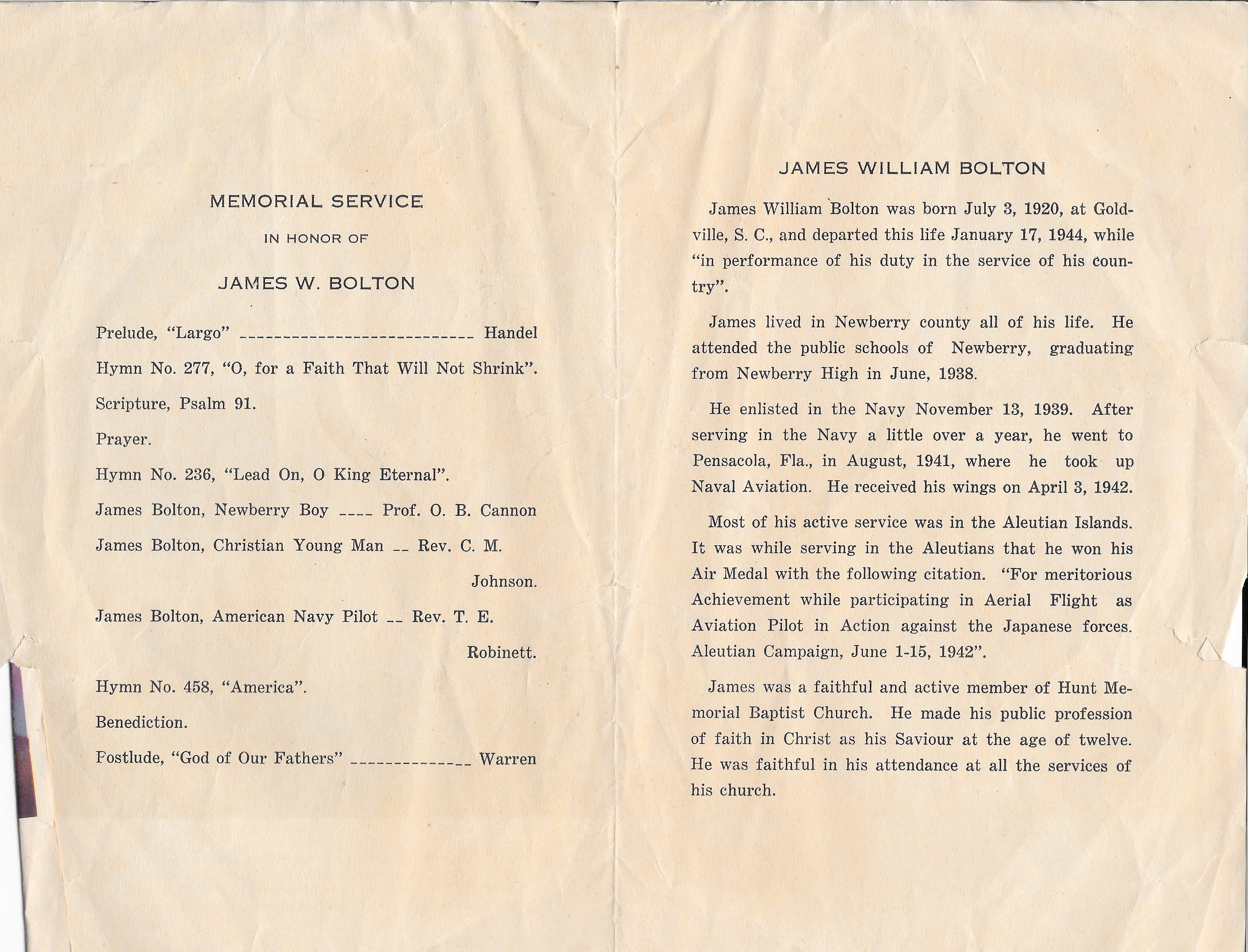 James “Jim” William Bolton died on January 17, 1944, when one of his Navy PBY-5 Catalina amphibious patrol plane engines exploded, and the plane crashed into the Pacific near Attu Island, Alaska. His body was never recovered. He was 23 years old. He is commemorated at the Honolulu Memorial on the Courts of the Missing in the National Memorial Cemetery of the Pacific in Honolulu, Hawaii, and on a marker in the Rosemont Cemetery in Newberry, South Carolina.