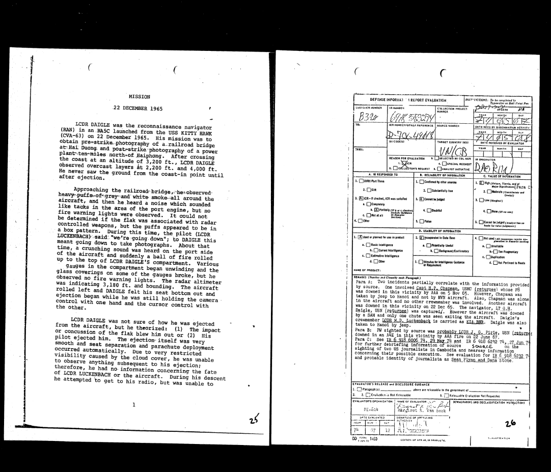 On December 22, 1965, Commander Max Lukenbach and Lieutenant Junior Grade Glenn H. Daigle were assigned to a reconnaissance mission. They were tasked to photograph a railroad bridge at Hai Duong, and a strategic power plant in a heavily defended area targeted on a previous mission. Despite unfavorable weather conditions and intense antiaircraft and missile defenses, the crew pressed forward. While making a reconnaissance pass over the Hai Duong Railroad Bridge, the aircraft, Flint River 603, was downed by one of three surface-to-air missiles (SAMs).
