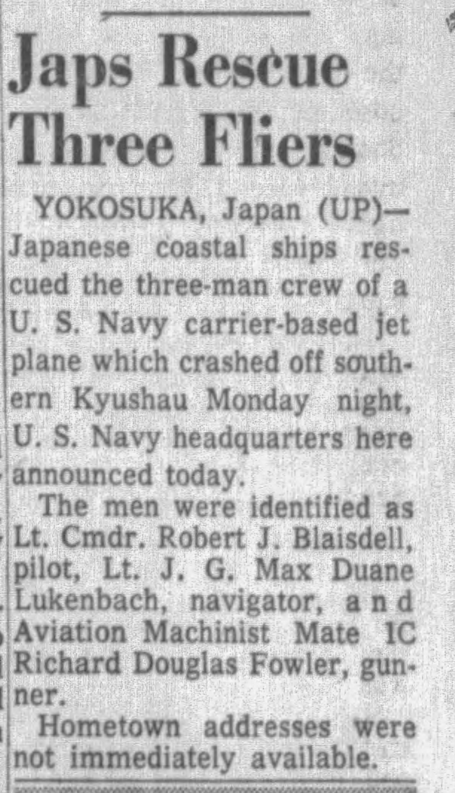 “Japs Coastal Ships Save US Jet Crew.” The Sandusky Register [Sandusky, OH], October 15, 1957. Newspapers.com (4853317).