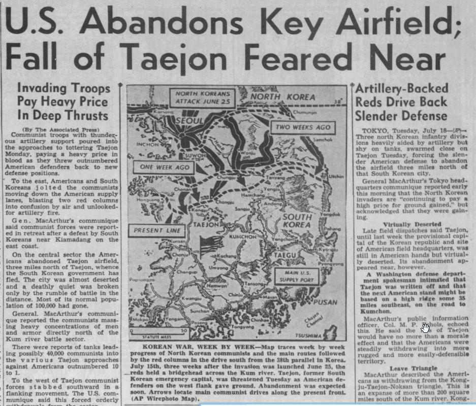 “U.S. Abandons Key Airfield; Fall of Taejon Feared Near.” The Ponca City News [Ponca City, OK], July 17, 1950. Newspapers.com (603222820).