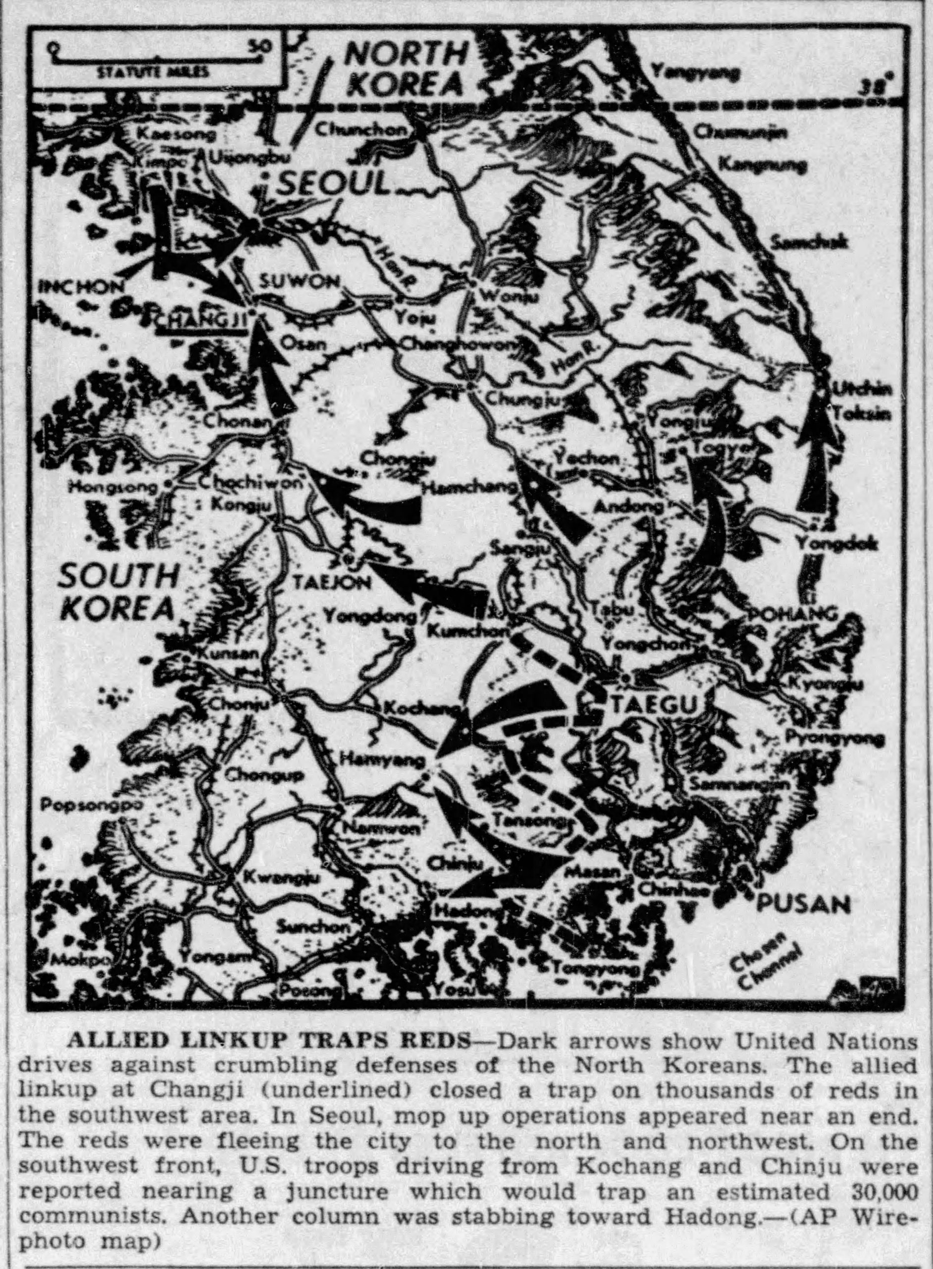 “Enemy Troops Flee in Panic Toward ‘Haven’ of Boundary.” The Ponca City News [Ponca City, OK], September 28, 1950. Newspapers.com (603225959).