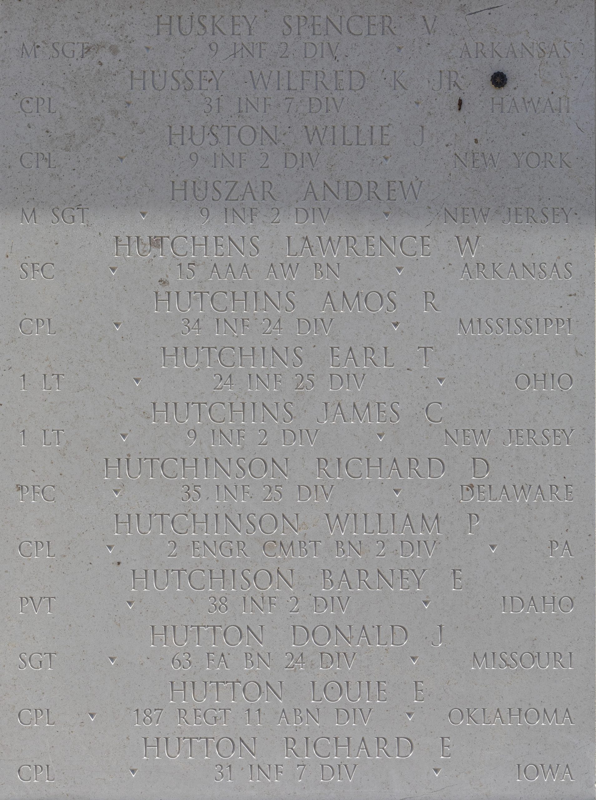 Amos Hutchins’s remains were never recovered. His name is listed on the Honolulu Memorial at the National Memorial Cemetery of the Pacific in Honolulu, Hawaiʻi.