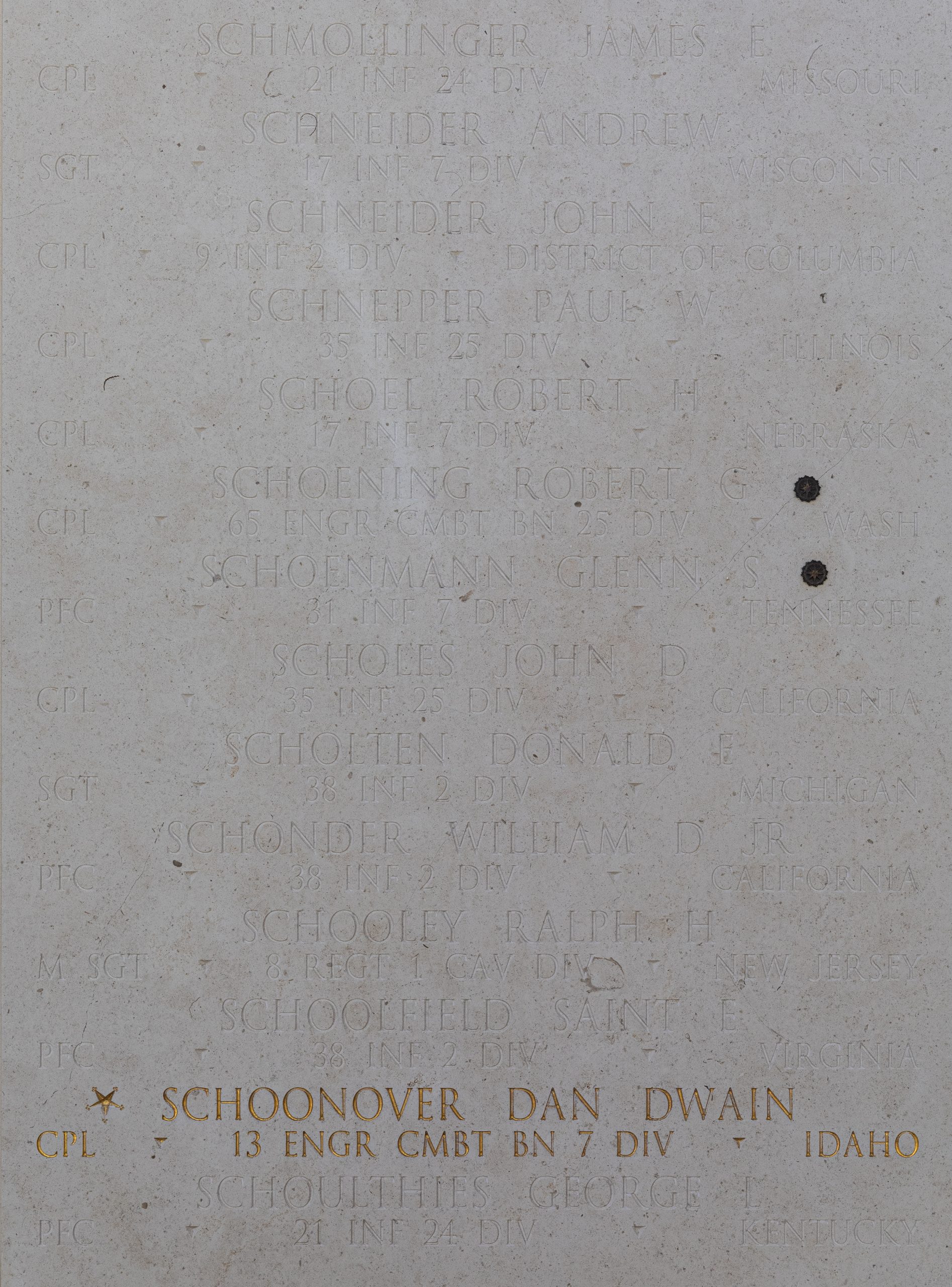 “Dan Dwain Schoonover.” American Battle Monuments Commission. Accessed March 30, 2025. https://weremember.abmc.gov/#!/s?v=G&a=c&q=*&type=16&criteria=title%3Dsch.