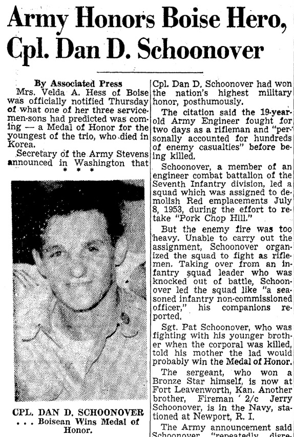“Army Honors Boise Hero, Cpl. Dan D. Schoonover.” The Idaho Statesman [Boise, ID], June 11, 1954.