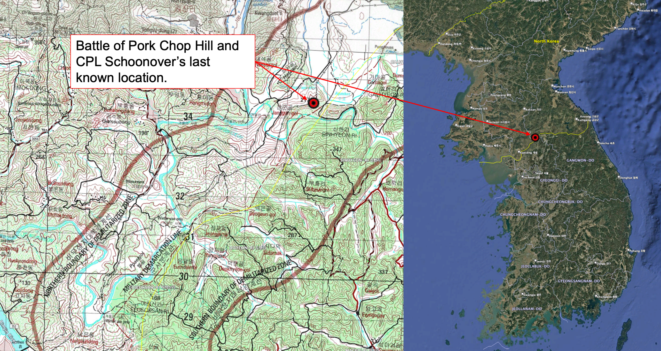 Corporal Daniel D. Schoonover’s body was never recovered. His last known location was in the demilitarized zone between North and South Korea in the vicinity of 52S CH 27060 34166 Military Grid Reference System (MGRS). His selfless sacrifice contributed to the establishment of the Democratic Republic of South Korea.
