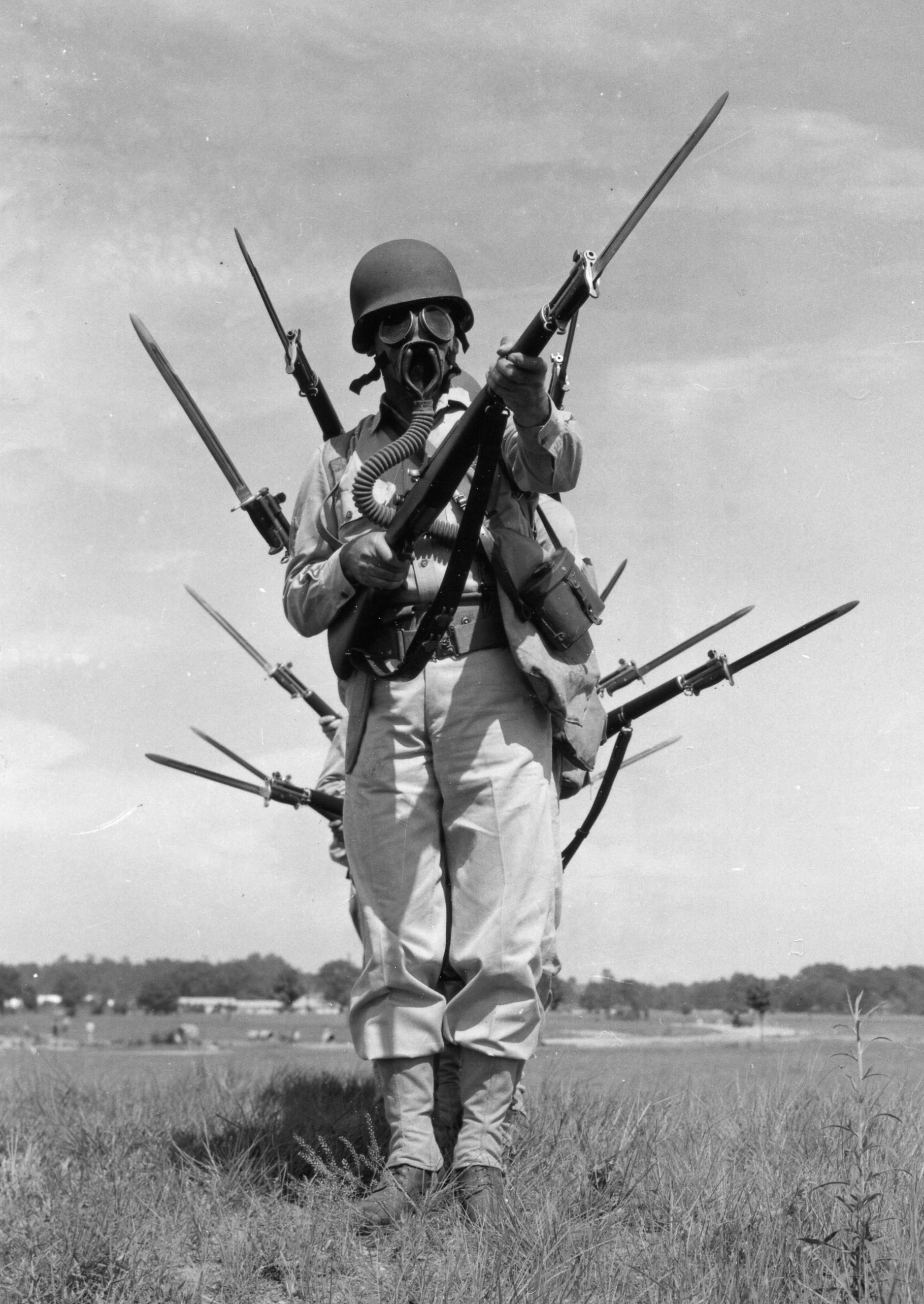 Photograph No. SC-122397; “This is how the U.S. Army Doughboy will appear to the enemy, gas mask included,” Photo by Mr. Frank Muto, Bureau of Public Relations, August 1941; National Archives at College Park, College Park, MD.
