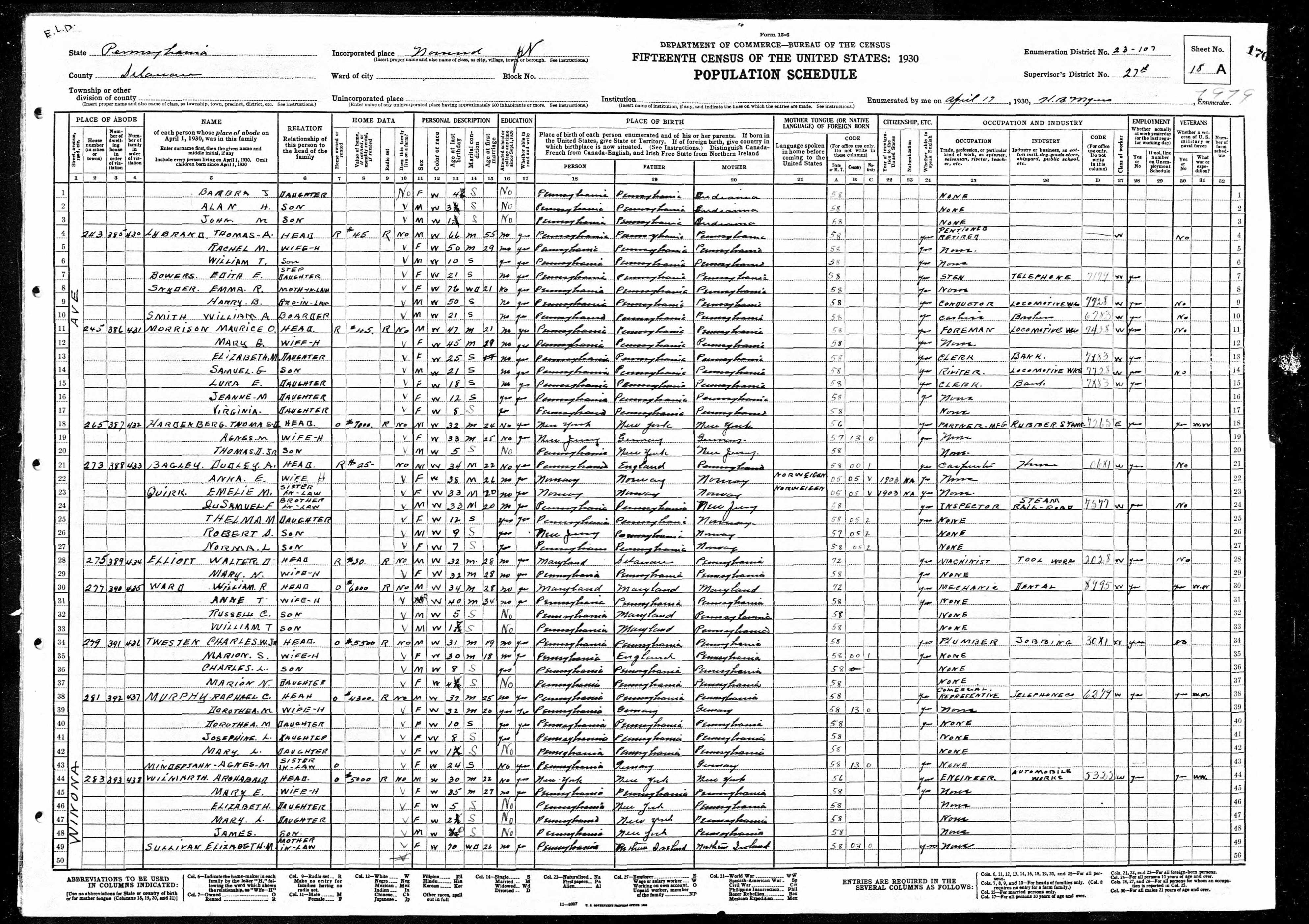 Pennsylvania. Delaware County. 1930 U.S. Census. Digital Images. ancestry.com.