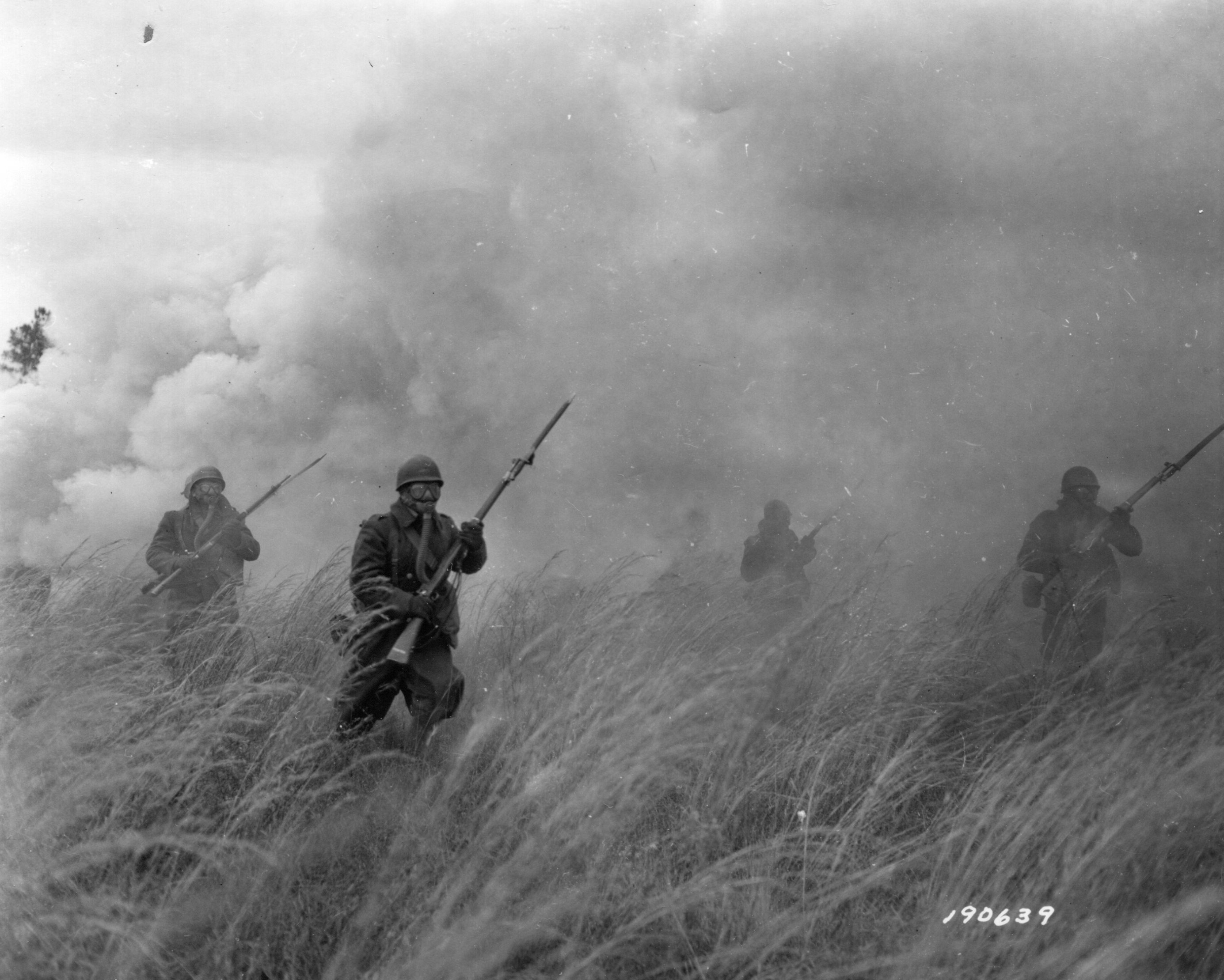 Photograph No. 190639; “Troops in action in gas attack, Fort McClellan, Alabama, 1943,” Department of the Army, U.S. Signal Corps, Photo #480-533-43-290-3, Maneuvers 9th Battalion, Lot #1461, National Archives at College Park, College Park, MD.