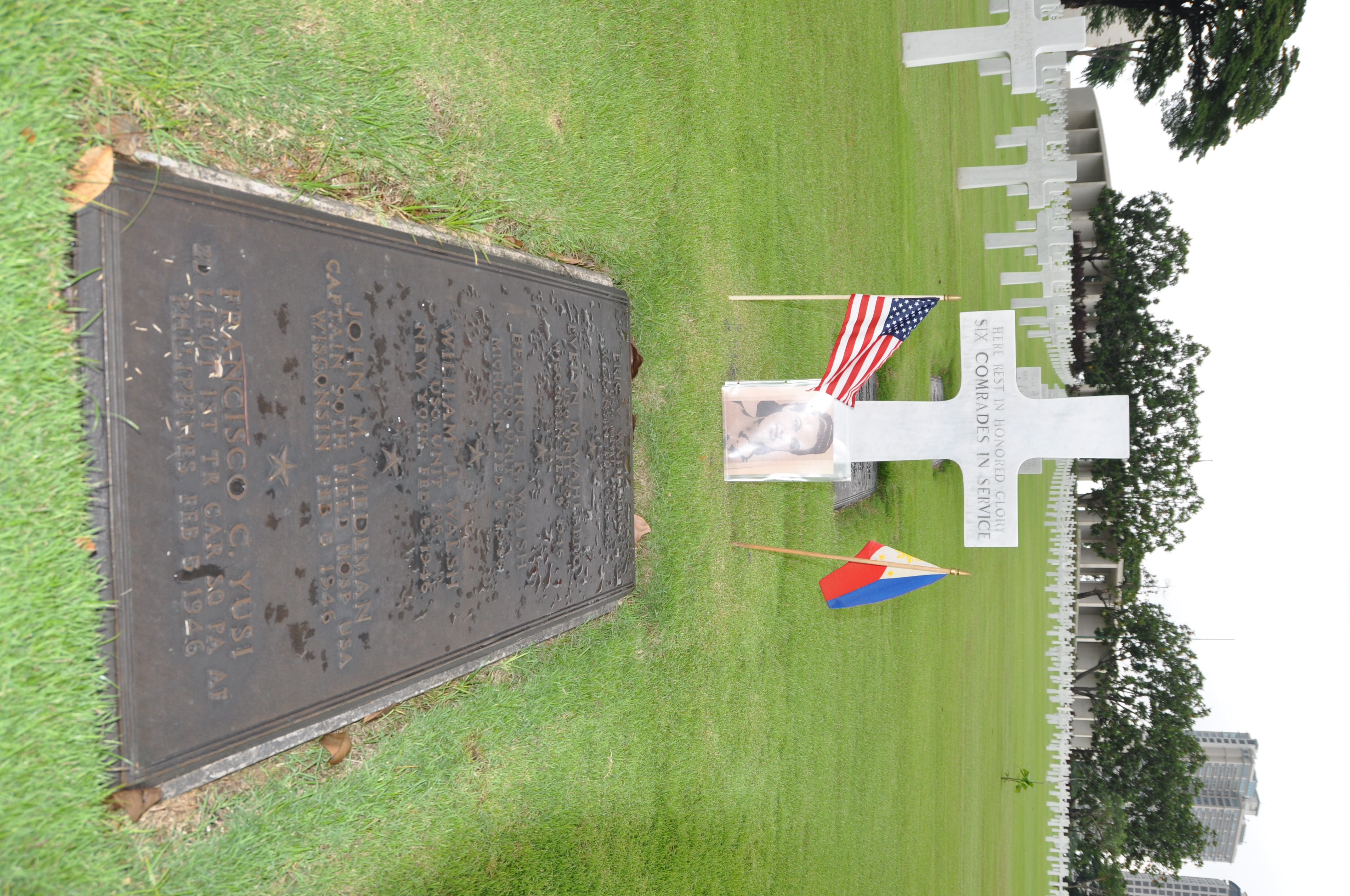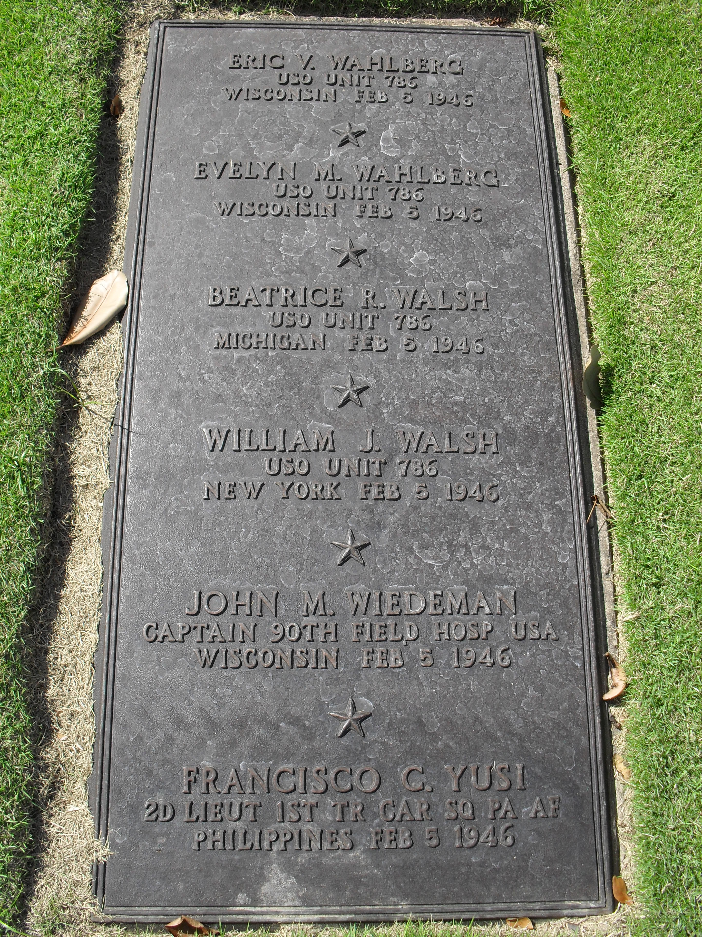 They were sent to Manila American Cemetery and buried together in a group grave. The Manila site was selected, a U.S. Army telegram noted, because the majority of the remains recovered were those of former members of the Philippine Army who were onboard. Evelyn was buried alongside her husband, Eric V. Wahlberg, fellow USO performers Beatrice and William Walsh, Captain John M. Wiedman and Lieutenant Francisco Yusi of the Philippine Army.