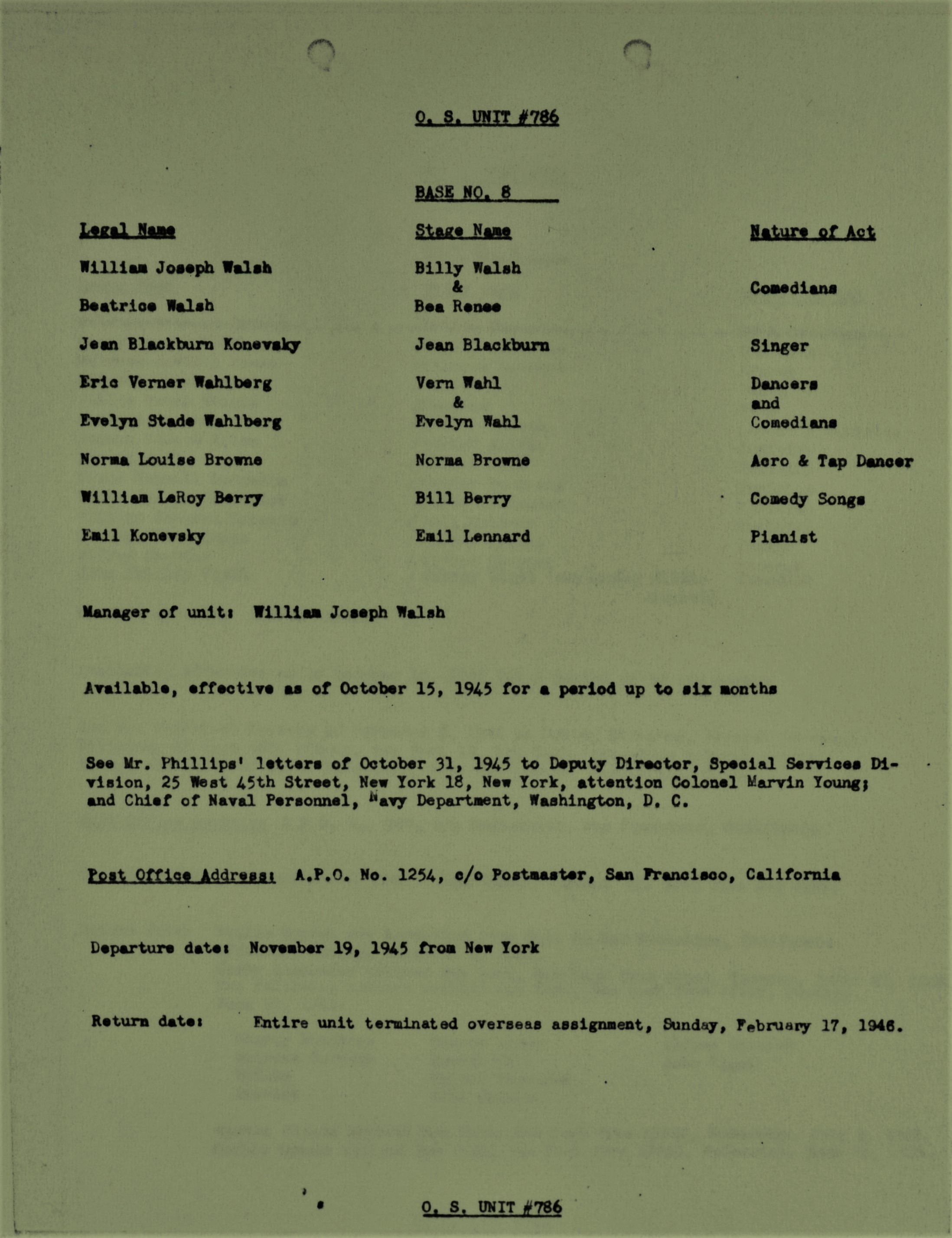 The Wahlbergs performed throughout the Southwest Pacific area with seven other USO performers in a group dubbed, “The Merry Madcaps.” When performing, the Wahlbergs both went by their stage names, “Evelyn and Vern Wahl.” For reasons of both safety and fuel-saving necessity, eleven military personnel from the Phillipines traveled with the entertainers.