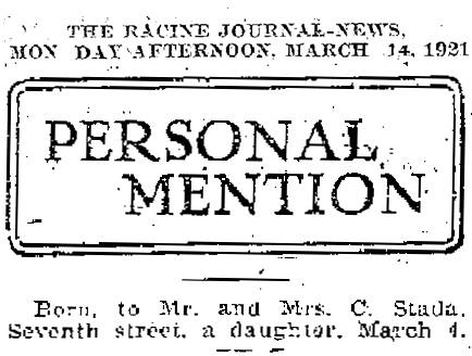 “Evelyn Stada Birth Announcement.” Racine Journal-News, March 1921.