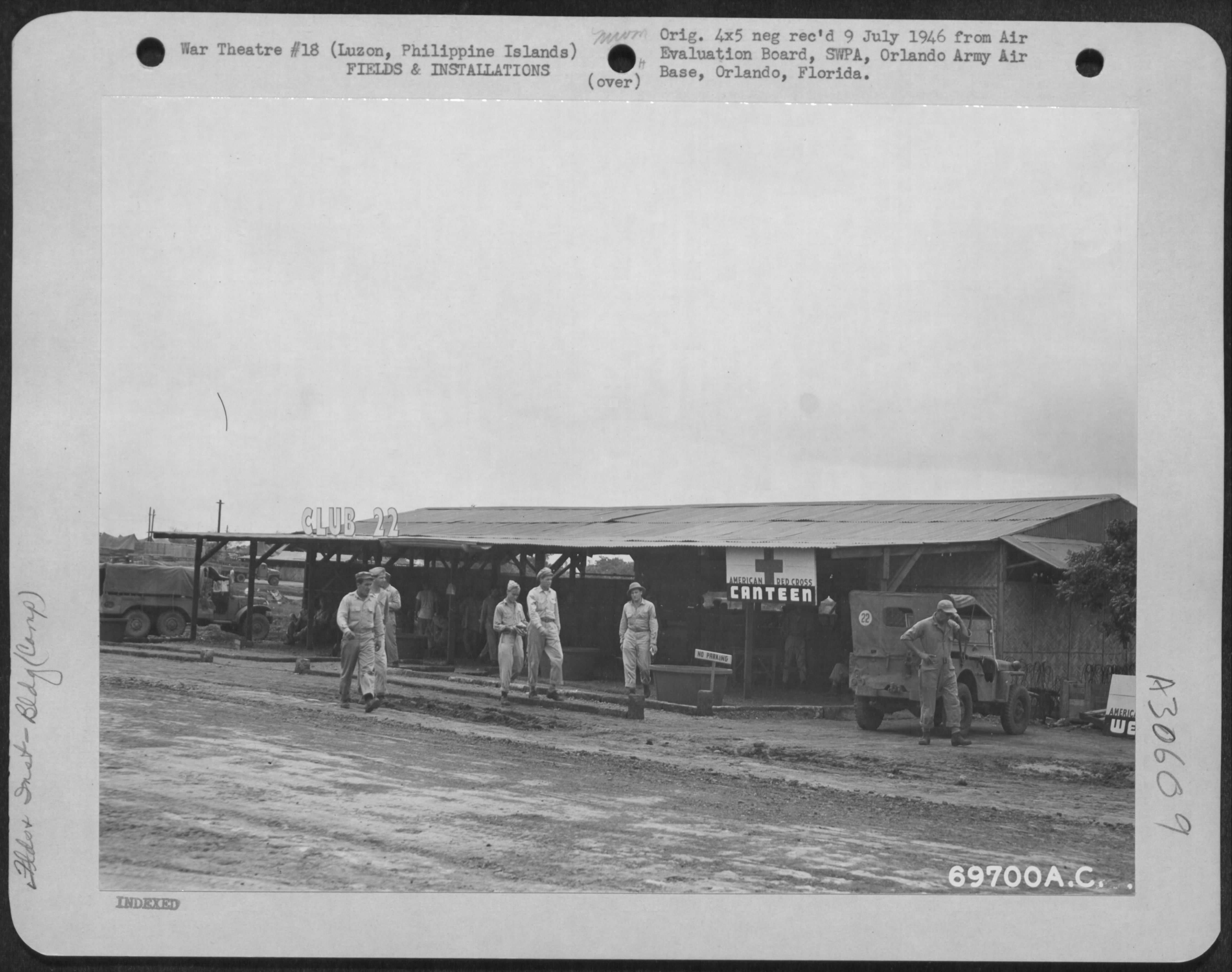 Exterior view of “Club 22,” the American Red Cross canteen at the 22nd Replacement Depot, Manila, Luzon, Philippine Islands. Photograph. August 20, 1945. National Archives and Records Administration (A30609). Image.