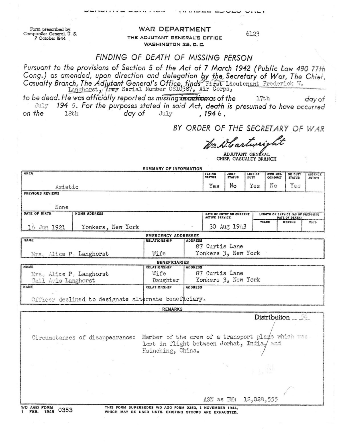 On July 17, 1945, Langhorst boarded a C-109 cargo plane as a co-pilot with three other crew members. It left Jorhat, India en route to an airbase in Chengtu, China. This was supposed to be a routine mission, hauling aviation gasoline. After giving a position report over Pathalipam, India, Langhorst and the three other crewmen were never heard from again. After an extensive search, nothing was found. Langhorst and his crew were declared dead one year and one day later, and their remains were designated as “non-recoverable.”