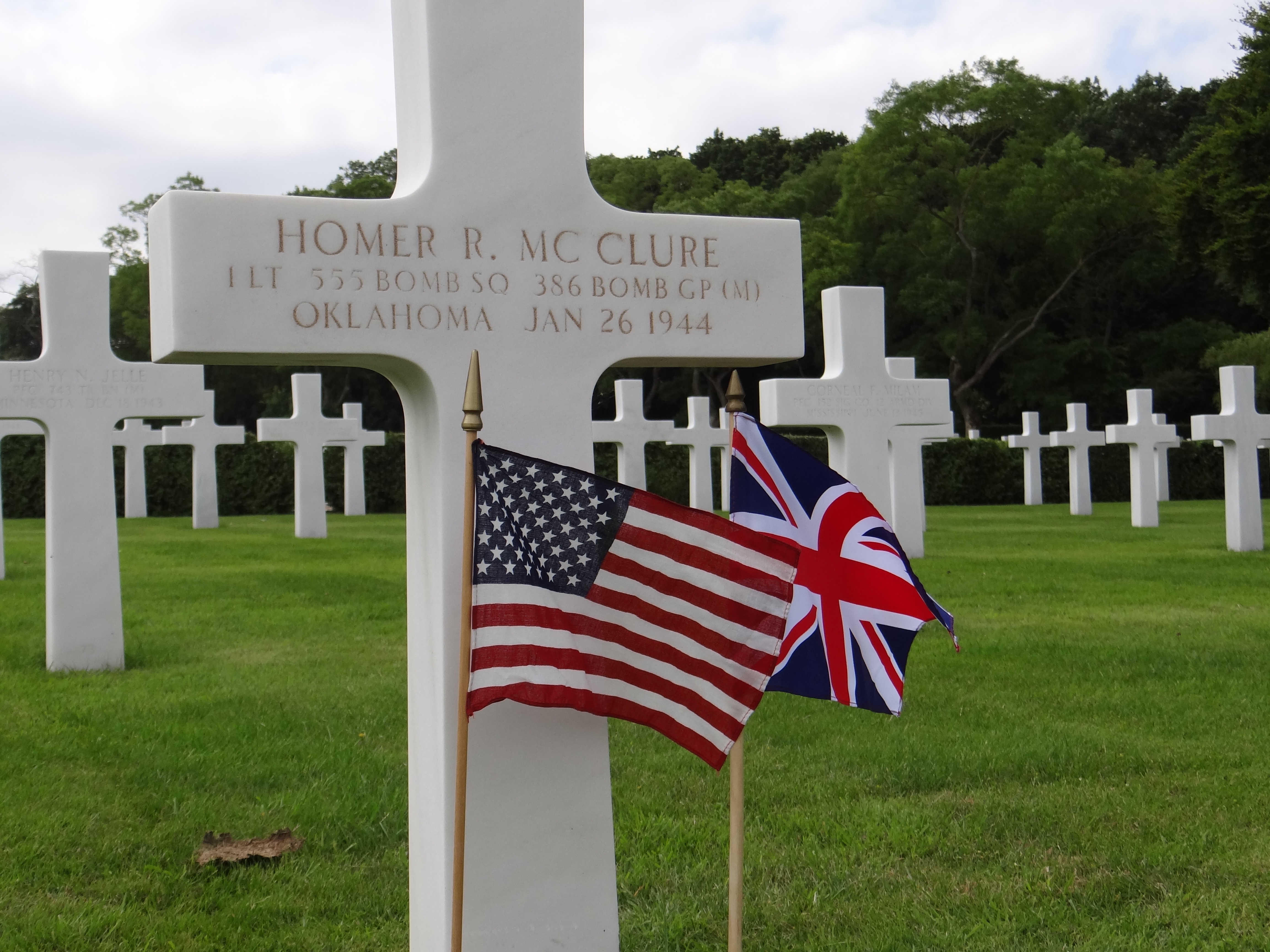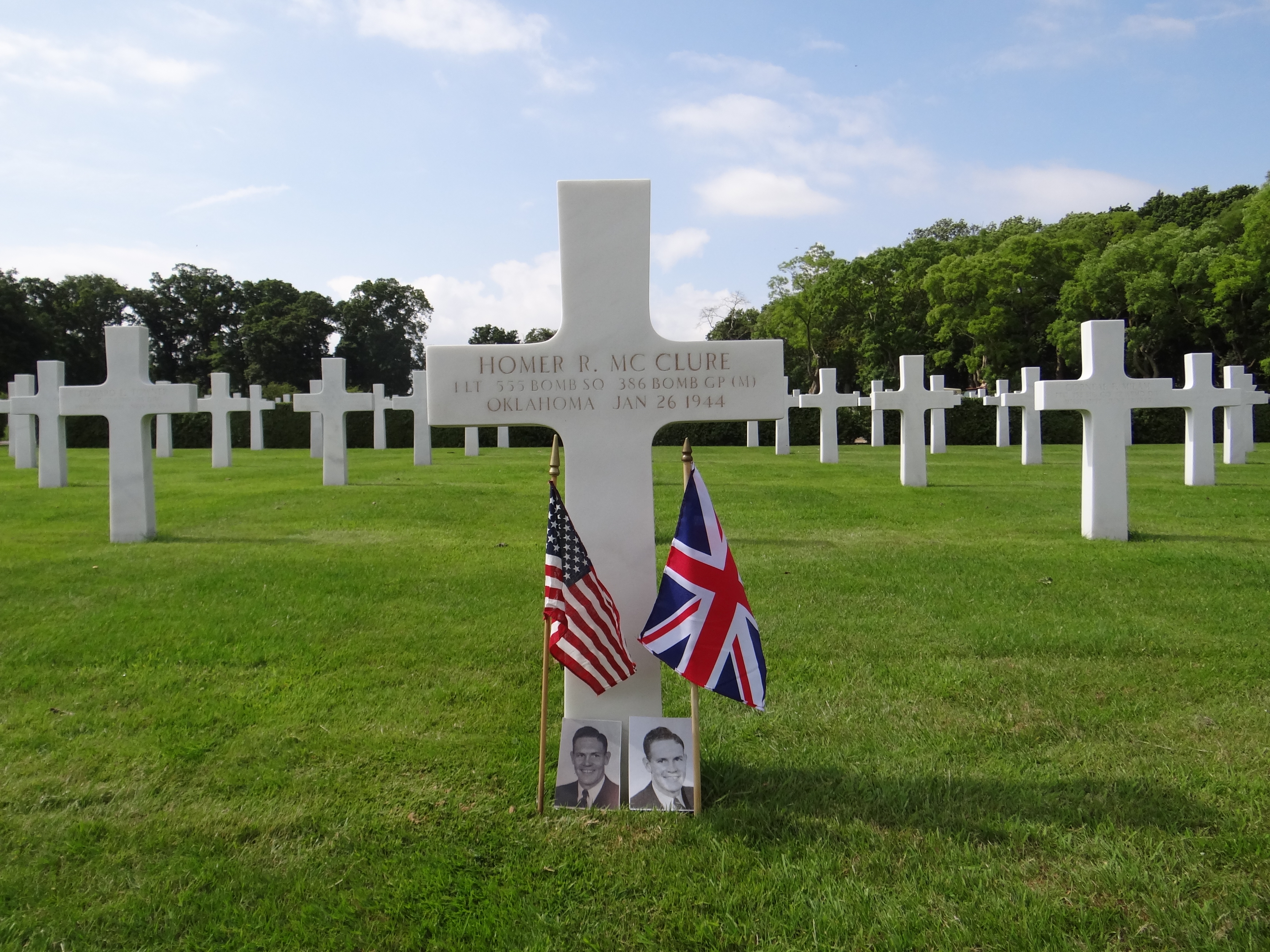 McClure’s body was buried in a temporary grave shortly after the plane crash. His wife, Bonnie McClure, was notified of his death. Following the end of the war, Mrs. McClure chose to have her husband buried in the Cambridge American Cemetery. A memorial including his flight crew stands in Crowborough, Sussex. Lieutenant McClure is also commemorated on the 386th Bomber Group memorial at Easton Lodge in Great Dunmow, Essex, United Kingdom.