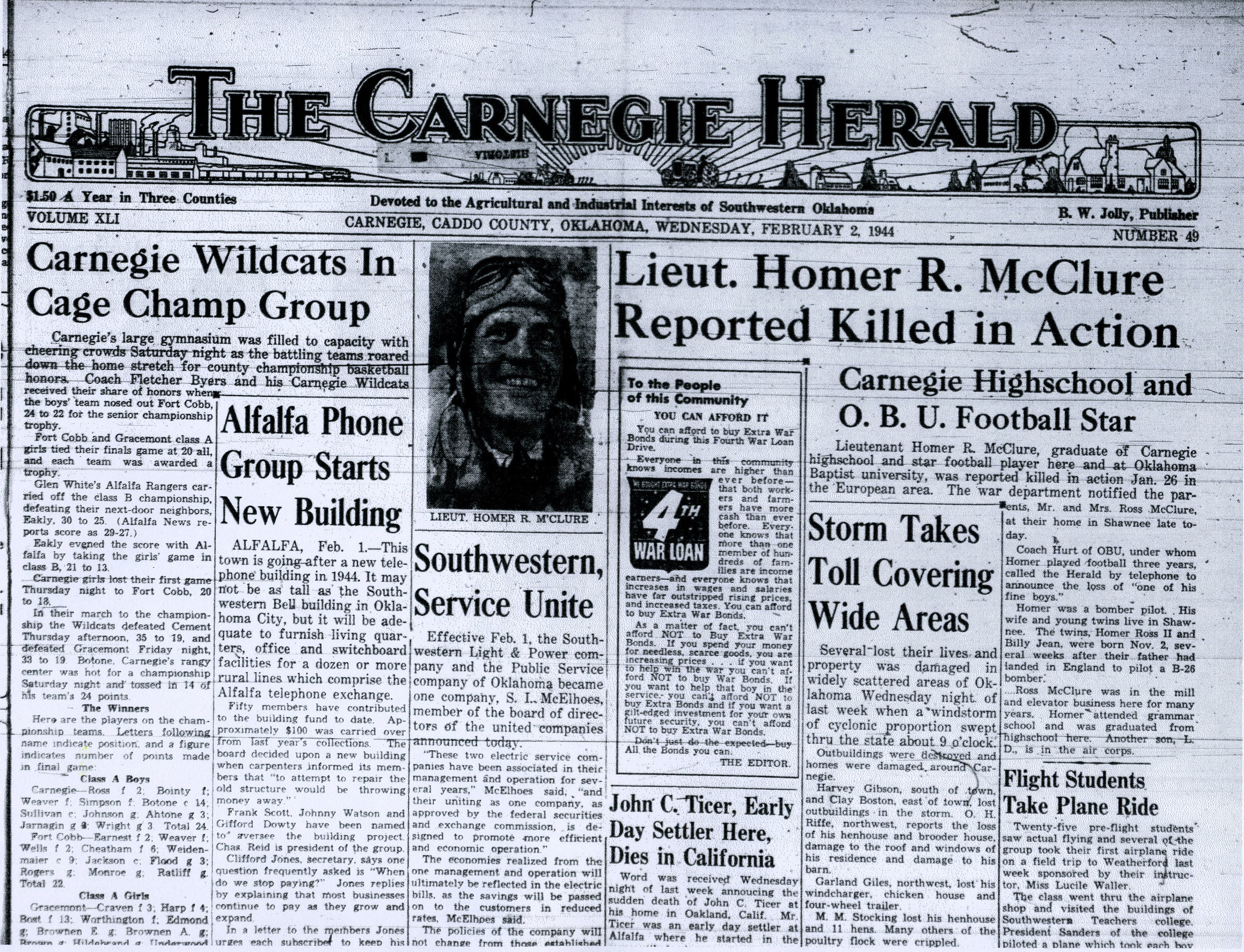 “Lieut. Homer R. McClure Reported Killed In Action.” The Carnegie Herald, February 2, 1944. Oklahoma History Center Archives.